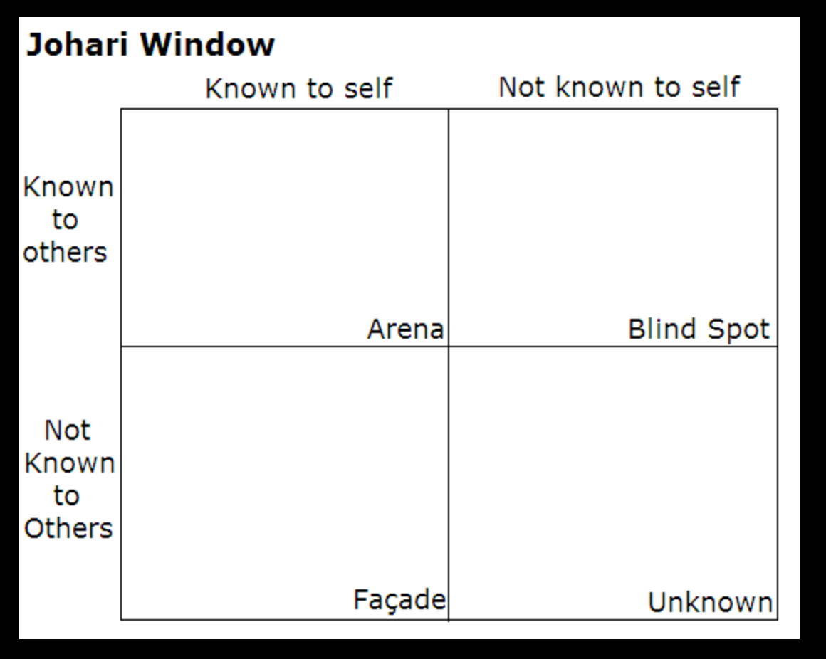Another helpful lens is the Johari Window, developed by by Joseph Luft and Harrington Ingham (using a combination of their first names!)..